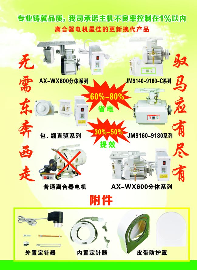 浙江義烏市馭馬機電設備有限公司,以多年的設備“節能”為研發主體,自主研發出高效節能的自動化電機,幫助設備生產企業快速提高設備的智能進化,同時大大降低耗電成本,其離合器電機與伺服節能電機之間的電費相差數倍,而且其質量不良率均在1%以內,在離合器電機最佳的更新產品中,省電提高60%-80%,而效率確提高30%-50%,內部包含外量定針器、內量定針器以及皮帶防護罩等。除此之外,馭馬產品還包含一體節能電機、分體節能電機、全自動剪線系統、拉鏈縫合機節能電機、定針位節能電機等產品,是縫制設備生產中的“奇跡”之作。