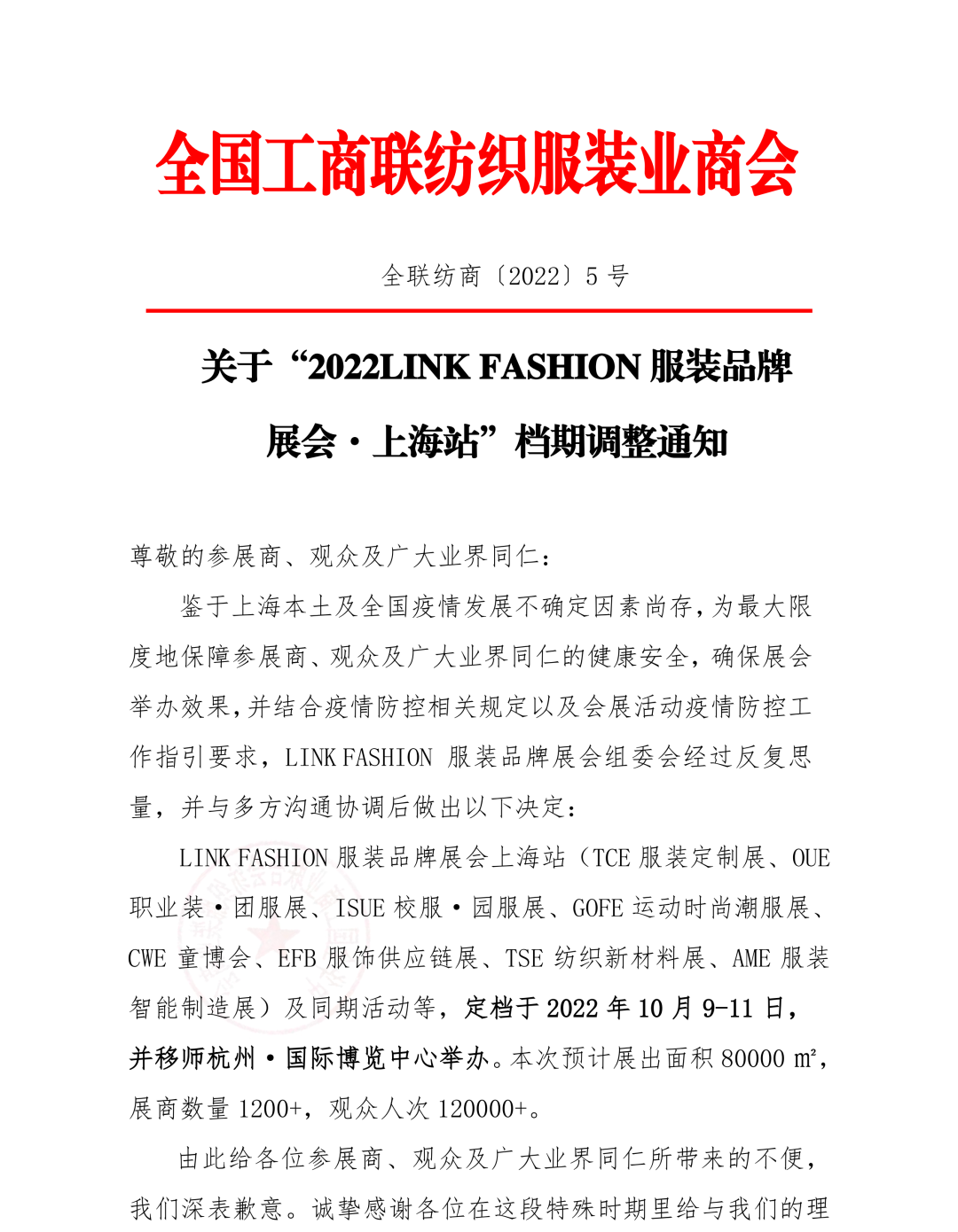 鑒于上海本土及全國疫情發展不確定因素尚存,為最大限度地保障參展商、觀眾及廣大業界同仁的健康安全,確保展會舉辦效果,并結合疫情防控相關規定以及會展活動疫情防控工作指引要求,LINK FASHION服裝品牌展會組委會經過反復思量,并與多方溝通協調后做出以下決定: