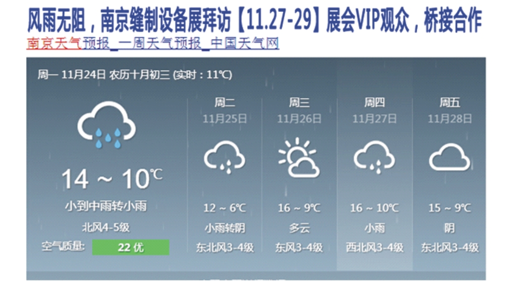 從中國氣象局了解到, 11月27日(南京縫制展開幕第一天)將有小雨,展會組委會溫馨提示行業內專業觀眾,請攜帶雨具參觀展會,更多天氣信息將會在展會官網及官方微信上發布,并時時通知您。