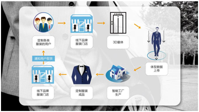 ● 然而,還有另一類利用“互聯網+”完成了完美逆襲的企業---便是衣得體,從量體采寸到個性化服裝的生產,深度融合“互聯網+”與“工業4.0”的概念,搭建了一條完整的服裝行業智能定制產業鏈,給客戶提供一個完美的全套解決方案,真正實現了智能化定制。而這塊也將作為重點產業鏈移至CITC中國服裝定制展,為“人體大數據”服務。
