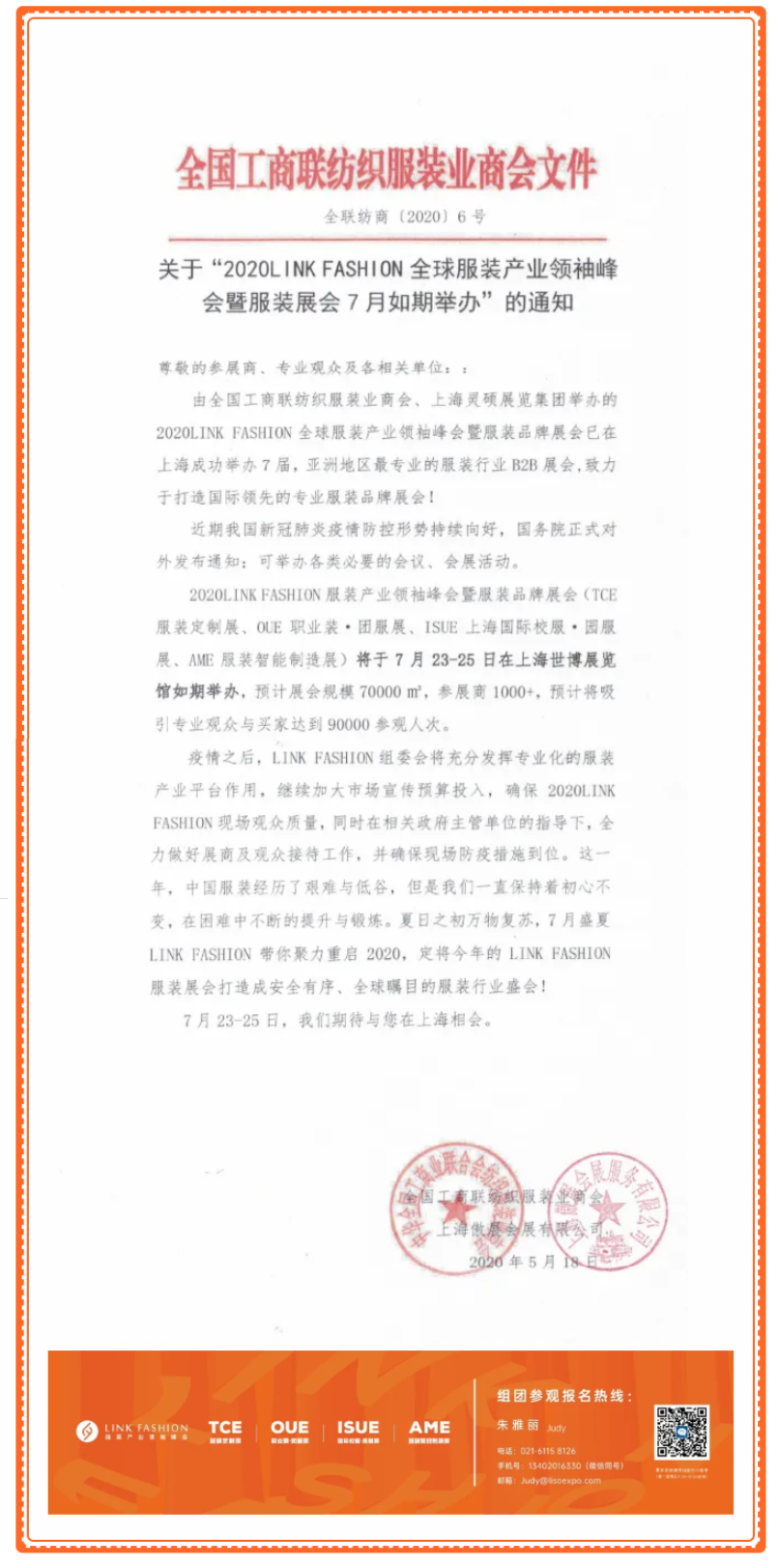 關(guān)于2020LINK FASHION全球服裝產(chǎn)業(yè)領(lǐng)袖峰會(huì)暨服裝展會(huì)7月如期舉辦通知